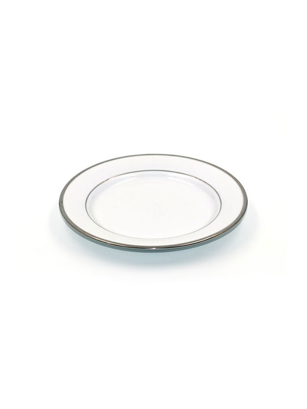 Our 7.5" platinum trim white salad plate is a fine china with a thin silver border. This is an example of where you can get the luxury without the expense.